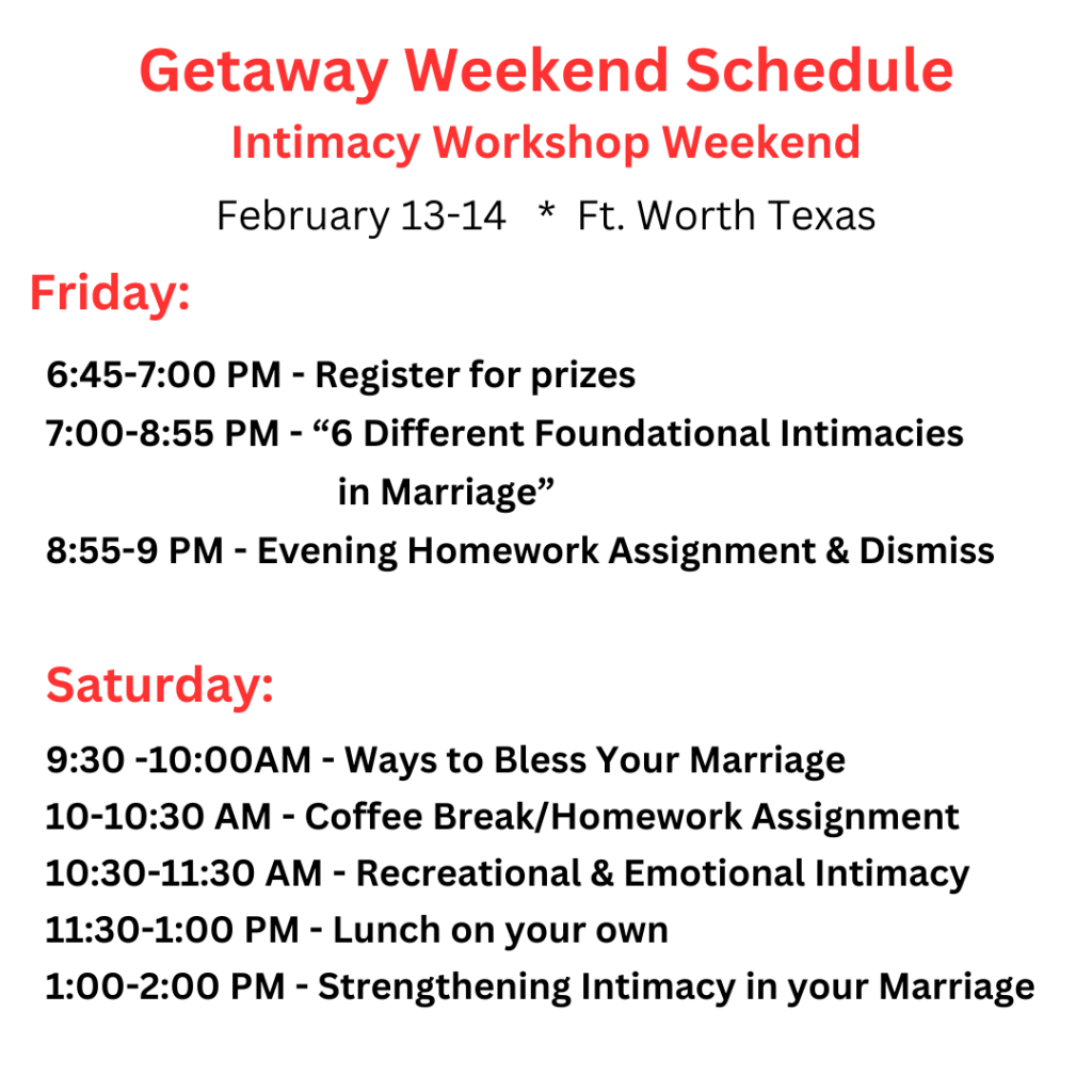 There will be lots of giveaways and just an extra fun marriage weekend. The workshop will start on Friday night at 7 PM and again on Saturday morning (not too early), lasting until about 2 o’clock in the afternoon, which will allow time to do something fun for the rest of the day. There will be a few breaks for homework sessions and discussion time as a couple.